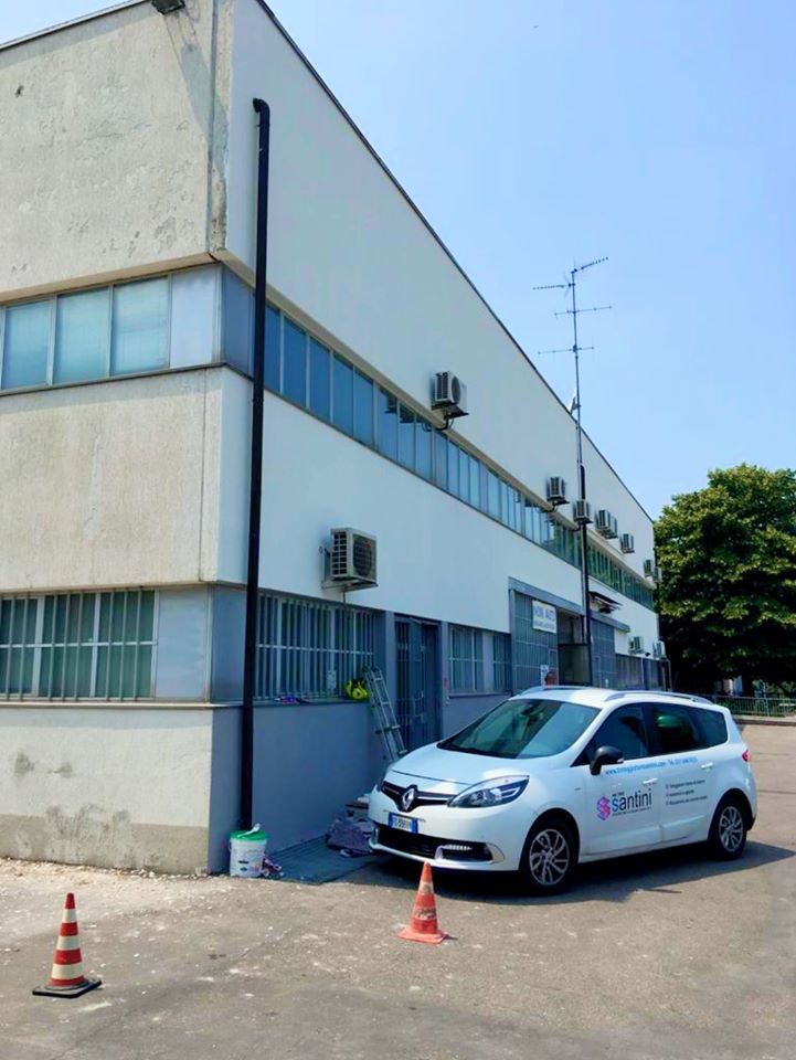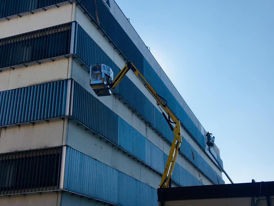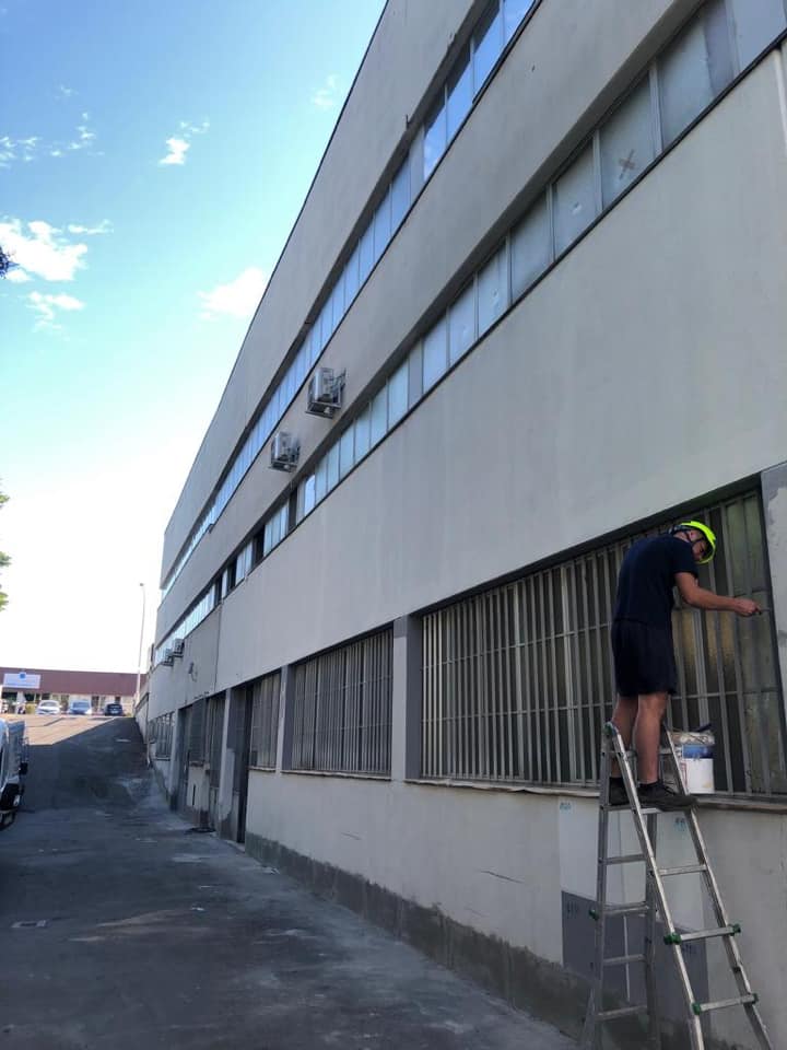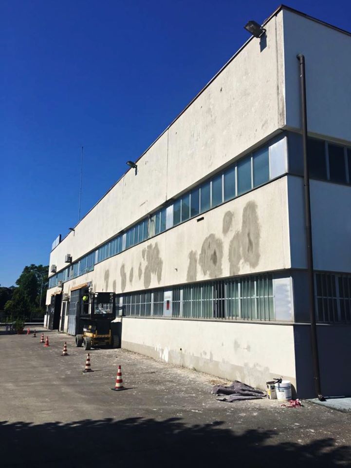 Quindi in appena 10gg con l’ausilio di piattaforme aeree di 20,22 & 27 metri di sbraccio abbiamo prima affogato la rete sulle pareti con apposita malta in due riprese,siliconato tutti i giunti ed ogni infisso che la percorre,preparato le superfici con apposito premer acrilico ed infine passato due belle mani di quarzo antialga per sconfiggere come è nostra abitudine ora e per sempre il formarsi di altre muffe
