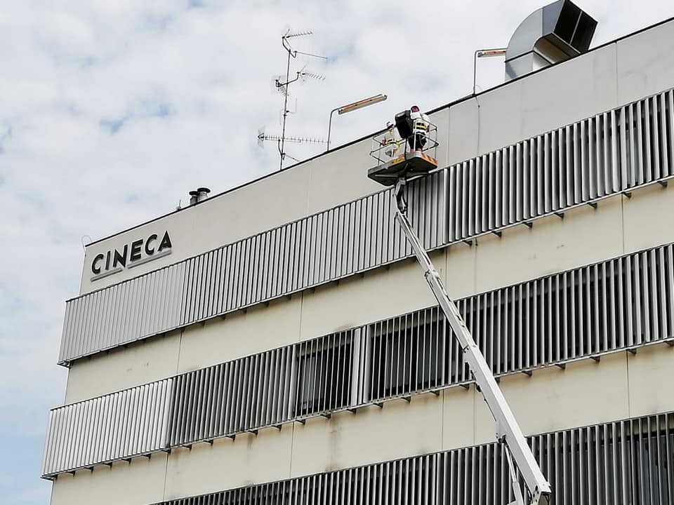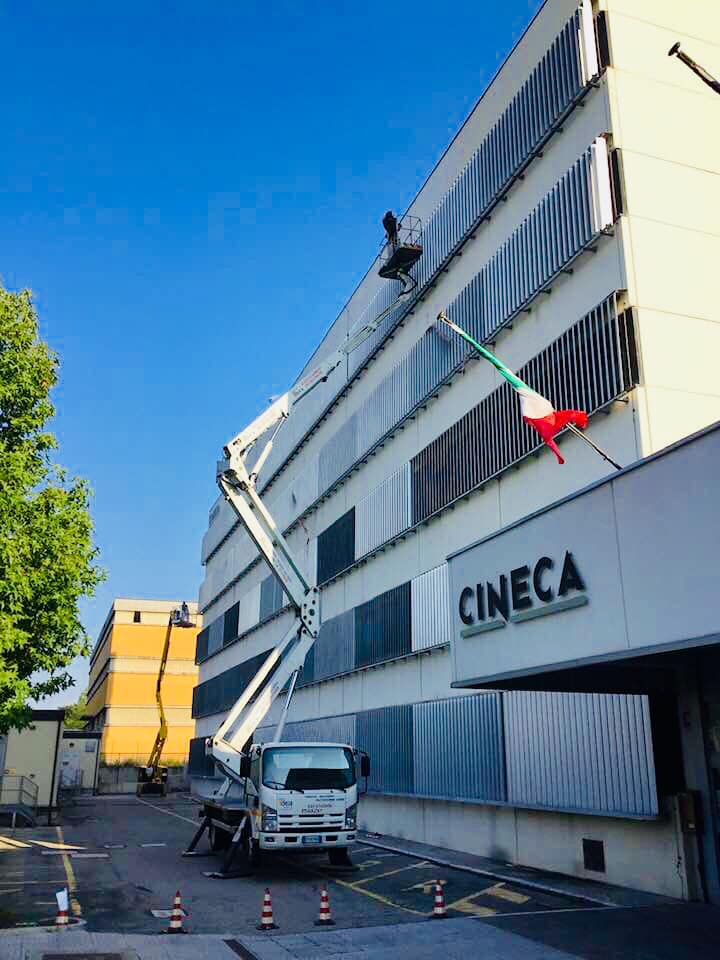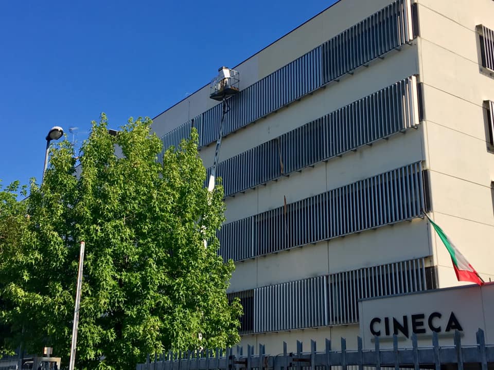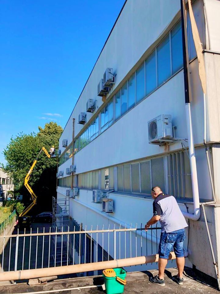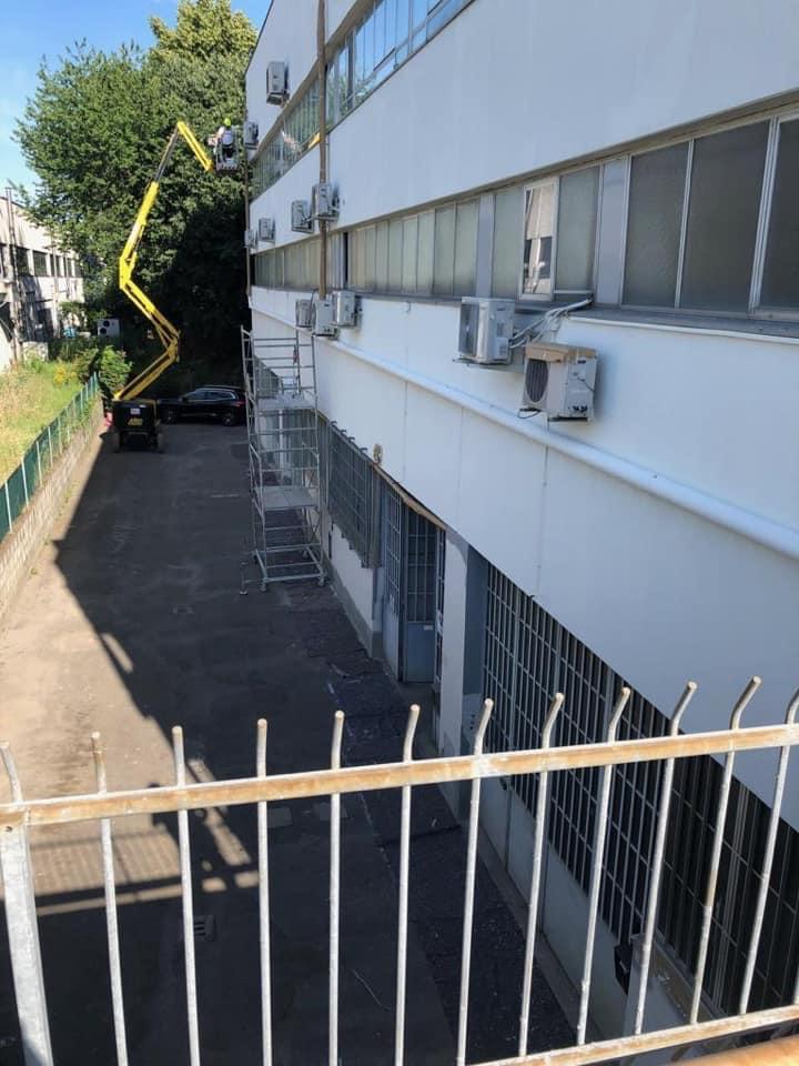 Quindi in appena 10gg con l’ausilio di piattaforme aeree di 20,22 & 27 metri di sbraccio abbiamo prima affogato la rete sulle pareti con apposita malta in due riprese,siliconato tutti i giunti ed ogni infisso che la percorre,preparato le superfici con apposito premer acrilico ed infine passato due belle mani di quarzo antialga per sconfiggere come è nostra abitudine ora e per sempre il formarsi di altre muffe